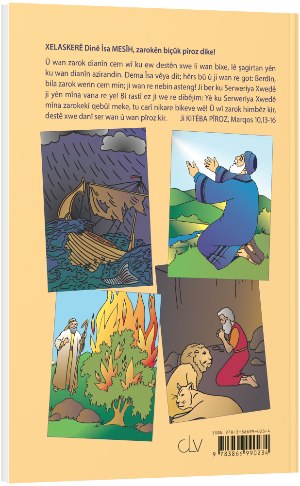 Diese erste Kinderbibel in kurdischer Sprache (Kurmandschi-Dialekt) enthält 19 Geschichten aus dem Alten Testament und 14 Geschichten aus dem Neuen Testament, die kindgerecht erzählt werden. Jedes Kapitel enthält farbige, jedoch einfach gestaltete Bilder. Am Ende jedes Kapitels befindet sich ein kleines Wörterbuch mit Wörtern aus dem vorhergehenden Text auf Kurdisch, Türkisch und Deutsch.