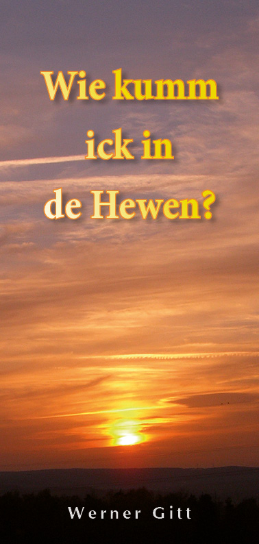 Ok de Hewen is ewich. Un dat is de Städ, an de Godd uns henn bringen much. Dorum loten Se sick inloden, in de Hewen to komen. Roopen Se de Nom vun de Herr an un booken Se dormit Se’s Hewen! No en Vördrach froch mie en Fruu ganz opgerecht: „Kann eens de Hewen öwerhaupt booken? Dat höört sick so no Reisebüro an!“ Ick stimmte ehr to: „Wer nich bookt, kummt nich an’t Ziel. Wenn Se no Hawaii wöölt, bruuken Se doch en gültige Fohrschien.“ Se frocht torüch: „De Fohrschien mutt doch betolt warrn?!“ - Oh jo, dat Billett to’n Hewen ok! Dat is awers so düer, dat keen en vun uns dat betolen kann. Dat is unse Sünd, de dat verhinnert. Godd duldet in sien Hewen keen Sünd. Wer no disset Lewen de Ewichkeid bi Godd in Hewen sien much, mutt eerst vun sien Schuld befriet warrn. Disse Befrieung kunn blots dörch en sündlose Person erwirkt warrn, un disse Person is Jesus Christus. He alleen is in de Loog to betolen! Un He hett mit sien Blood betold, dörch sien Dod an’t Krüütz.“